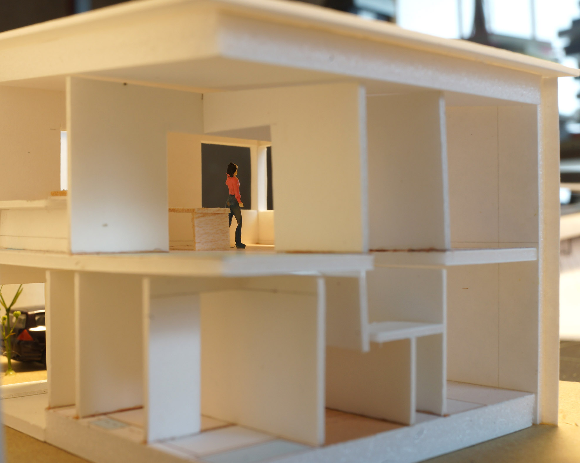 こちらの写真は、窓回りの枠納まりです。窓枠の厚みを薄くすることで枠の存在感を消しています。既製品枠だとどうしても、ぼてっとした印象になってしまいますが、このように納めると見た目がシャープになります。本来であれば、窓の外の景色をそのまま見たいのであって、サッシや窓枠の存在が完全に無くなるのが理想ではあるのですが、、、完全に隠してしまうには更に複雑な納まりを採用しなければならず、今回はシンプルな納まりにする、という方法にとどめています。窓の外には隣地の桜の木が見えています。隣の風景を拝借、借景として取り込んでいます。