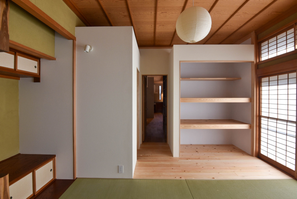 リノベーション工事前の和室です。畳エリアを一部、フローリング床に変更、収納スペースが少なかったため白いボックス状の収納を設けました。和の雰囲気の中に対比的な白い壁を設けることで、和とモダンが互いに引き立てあうように考えました。