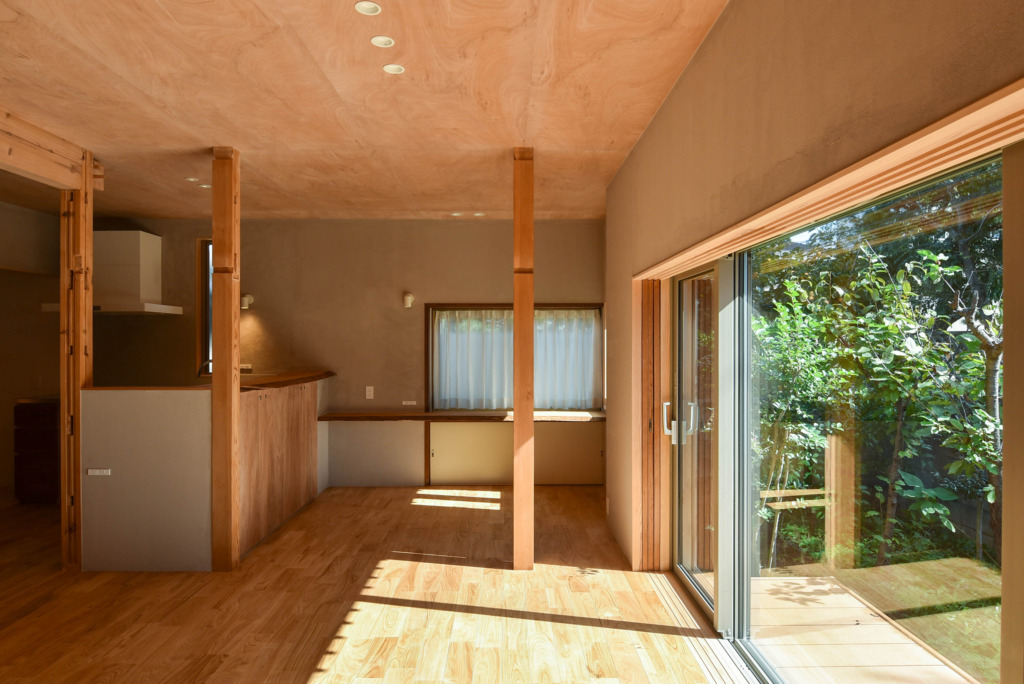 天井はラワン合板張り、床は栗無垢フローリング、家具・建具類はラワン合板仕上げ。濃茶系の木の色目に合わせるように、壁はグレーブラウン掛かったラフな塗装仕上げとしています。全体的に落ち着いた雰囲気となるようトーンを揃えています。