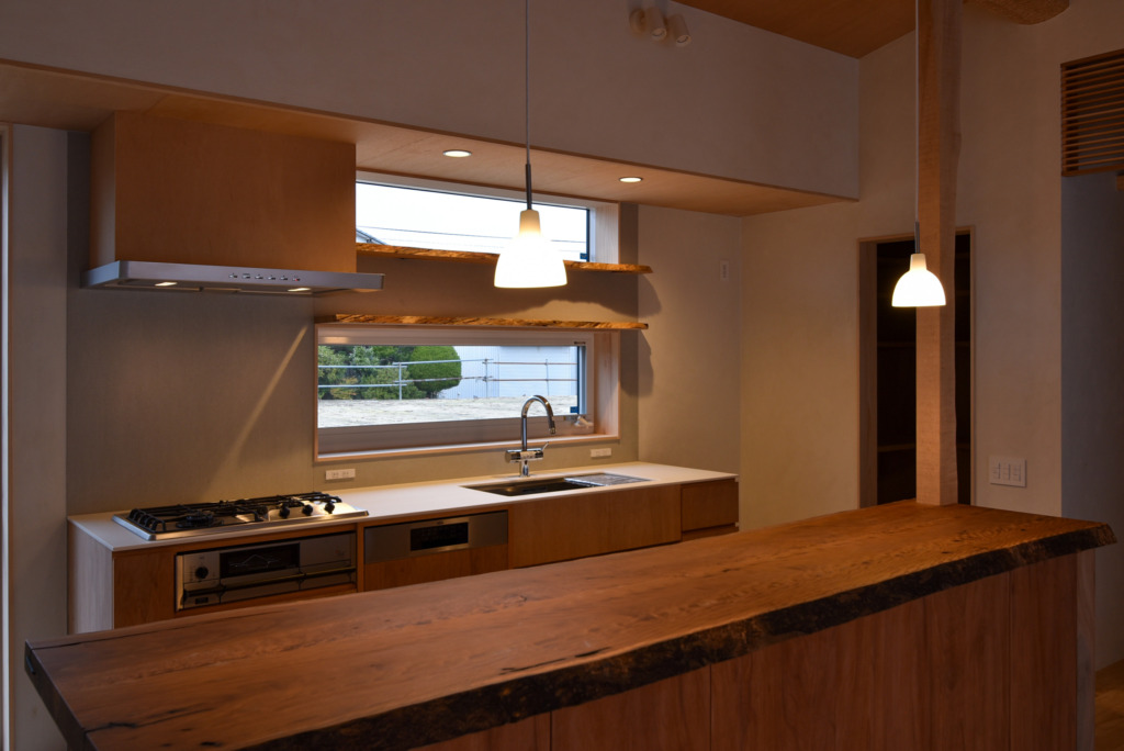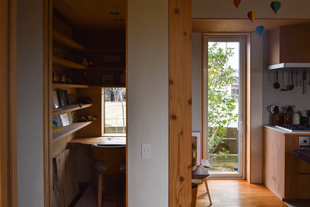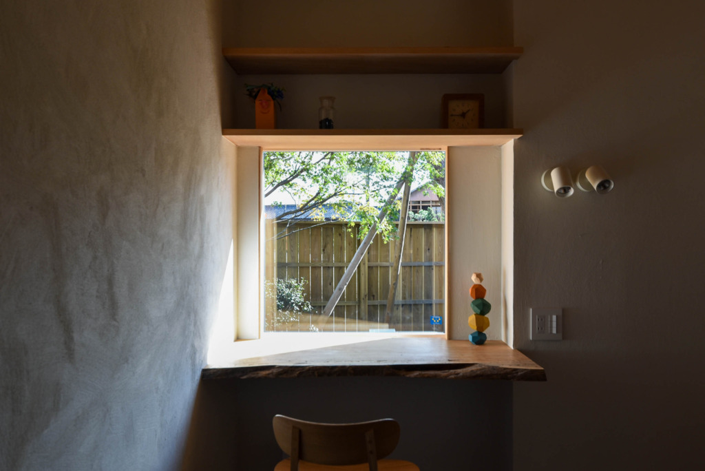 こちらの写真は、1.5帖の小さな書斎スペースです。カウンターを設け、正面に外を望める窓を設けています。やや暗めの仕上げ材を選んで、洞穴の中にいるような雰囲気にしました。ここに一人で籠っていると、時間が経つのを忘れてしまいます。