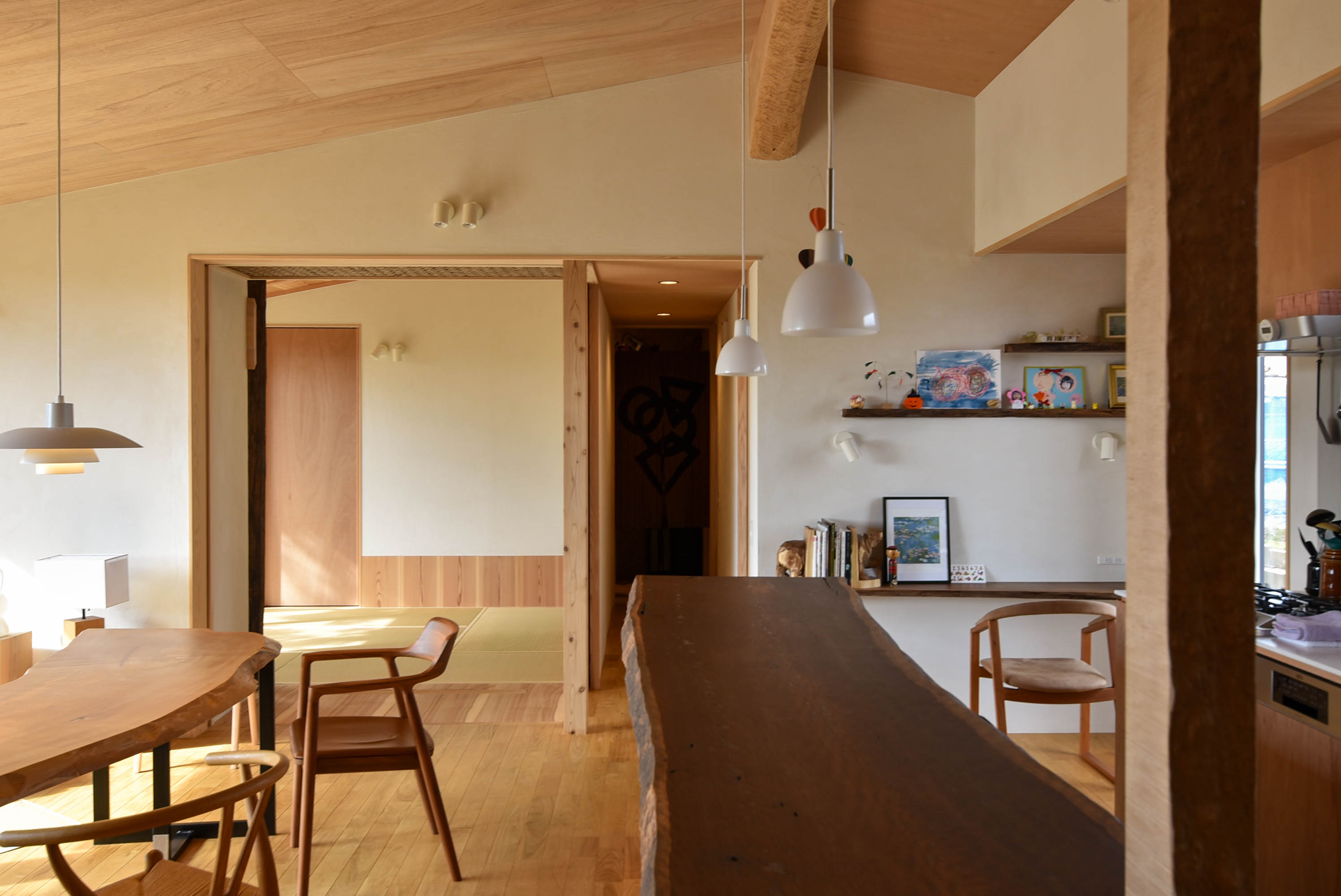 室内をオレンジ色に染め上げる朝夕の光は、季節や天候によって二度と同じ表情を見せません。その時々で変わる景色こそが、住まいの豊かな個性となります。
