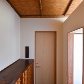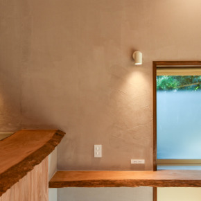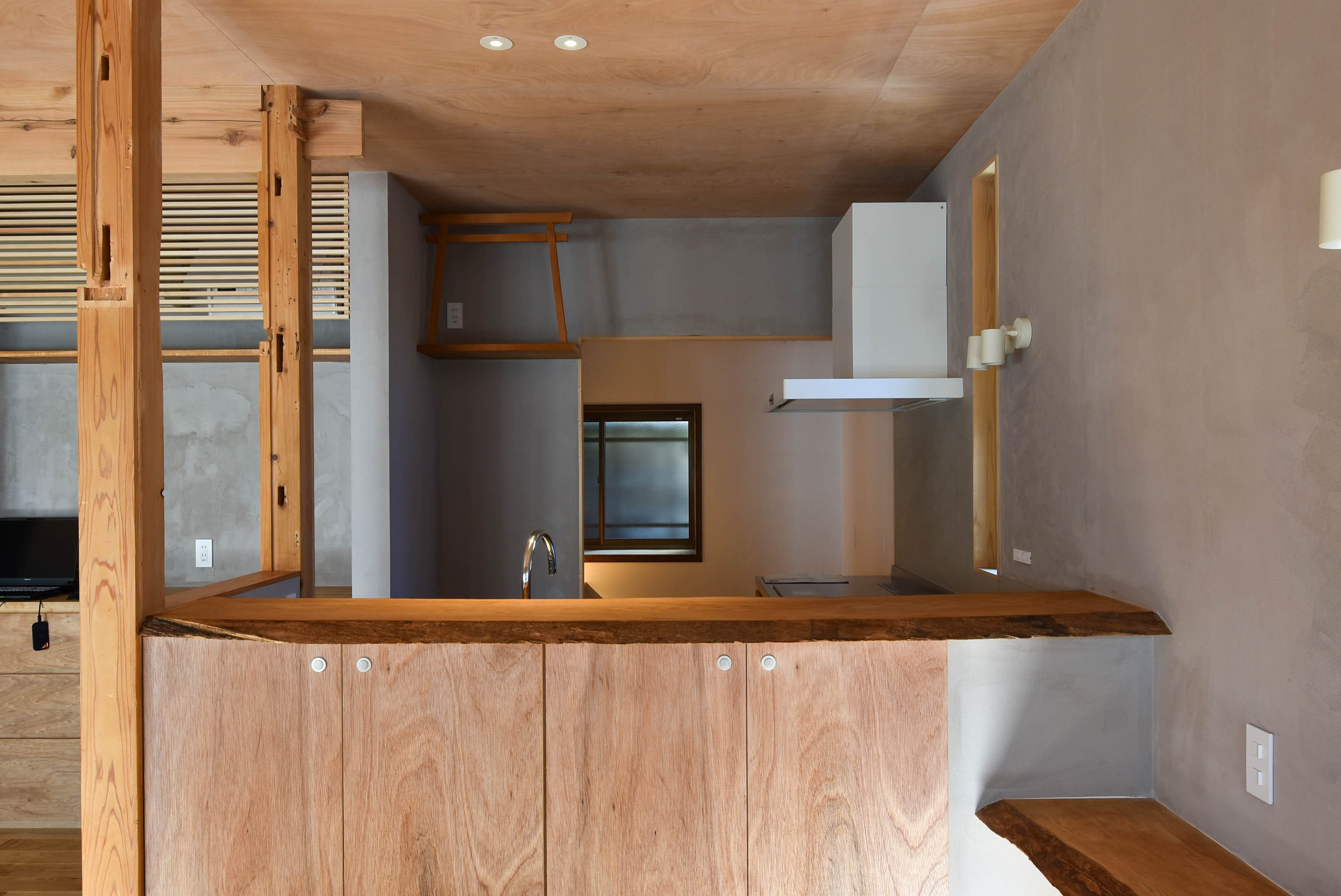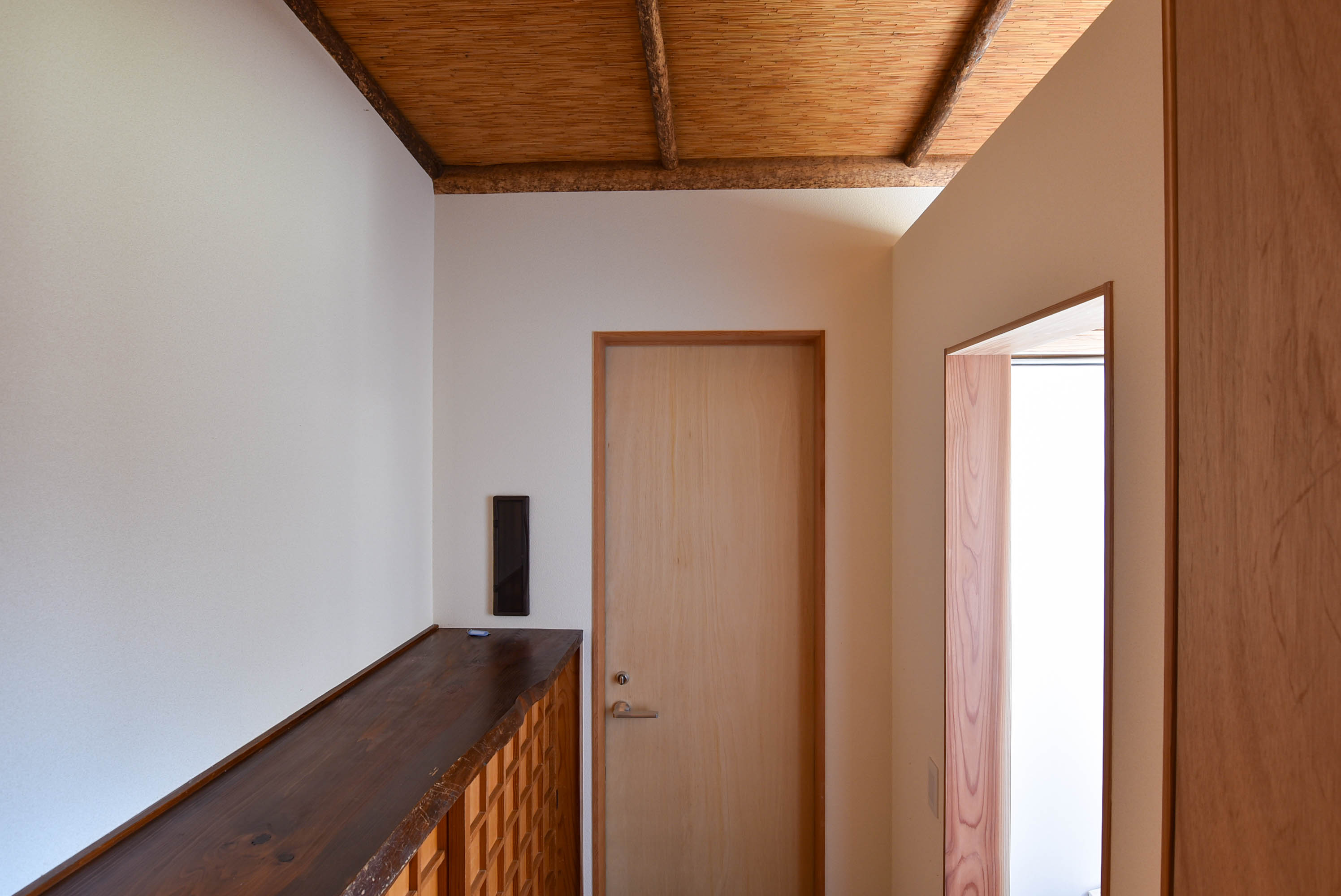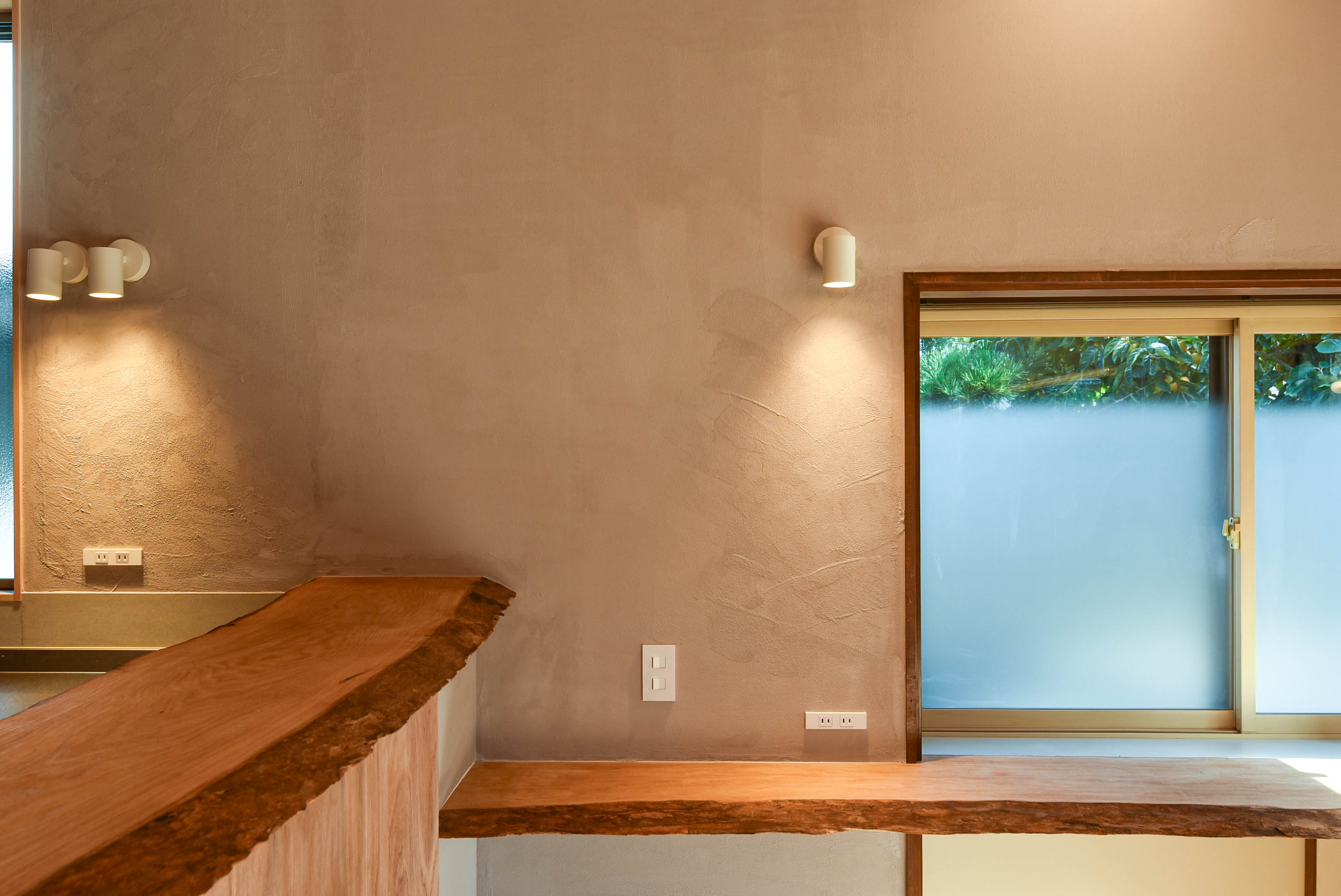 既存家屋の障子戸や網代天井などの昔ながらの納まりや仕上げ材を部分的に残し、そこに新たに作り込みを加えることで、懐かしくありながら新しくもある、新旧の対比的なバランスのユニークな空間を生み出しています。
